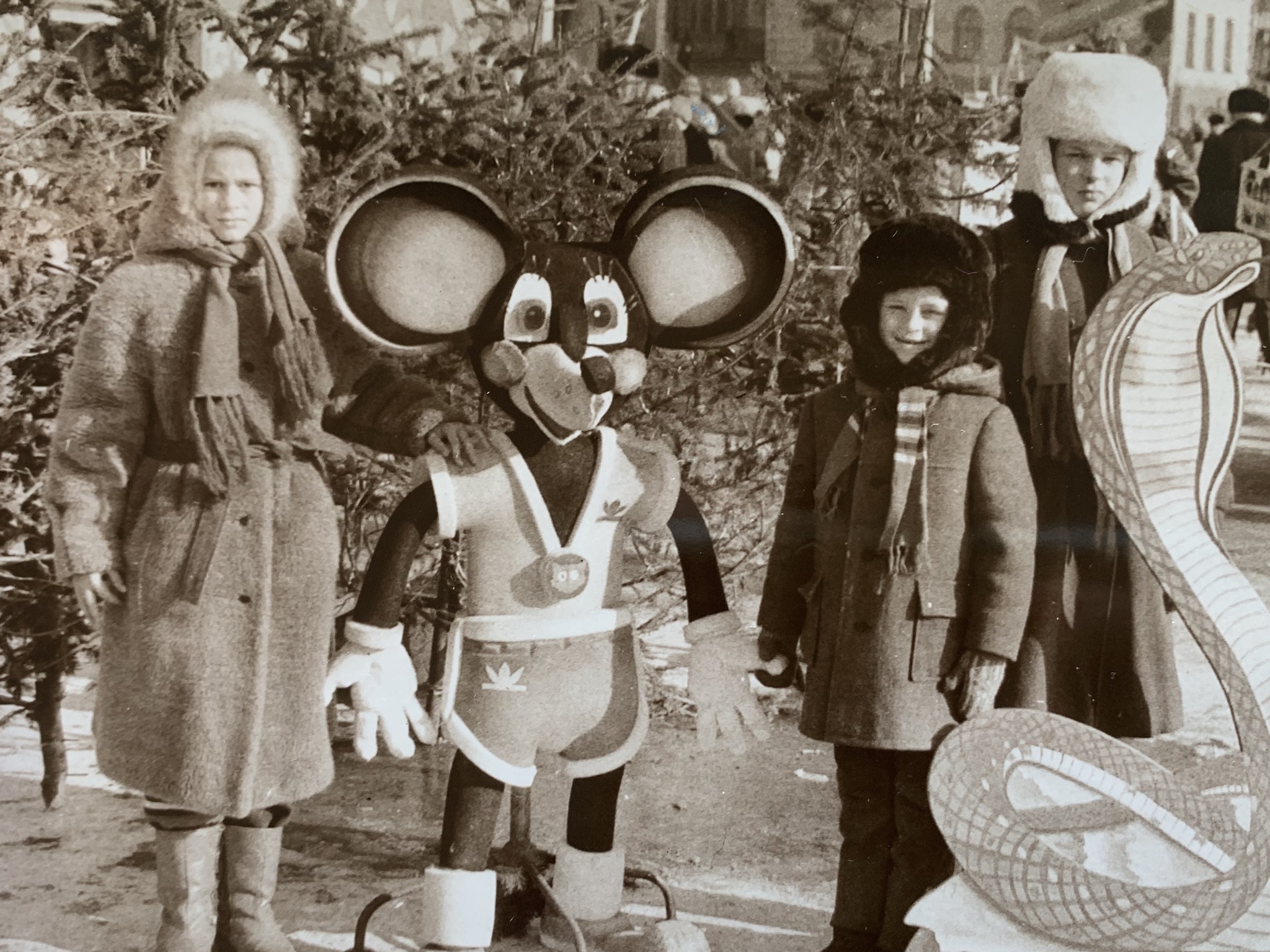Three children are standing in the snow in the city's main square. Rides. Ice skating. A huge wooden snake statue welcomes the new year. A Christmas tree.
